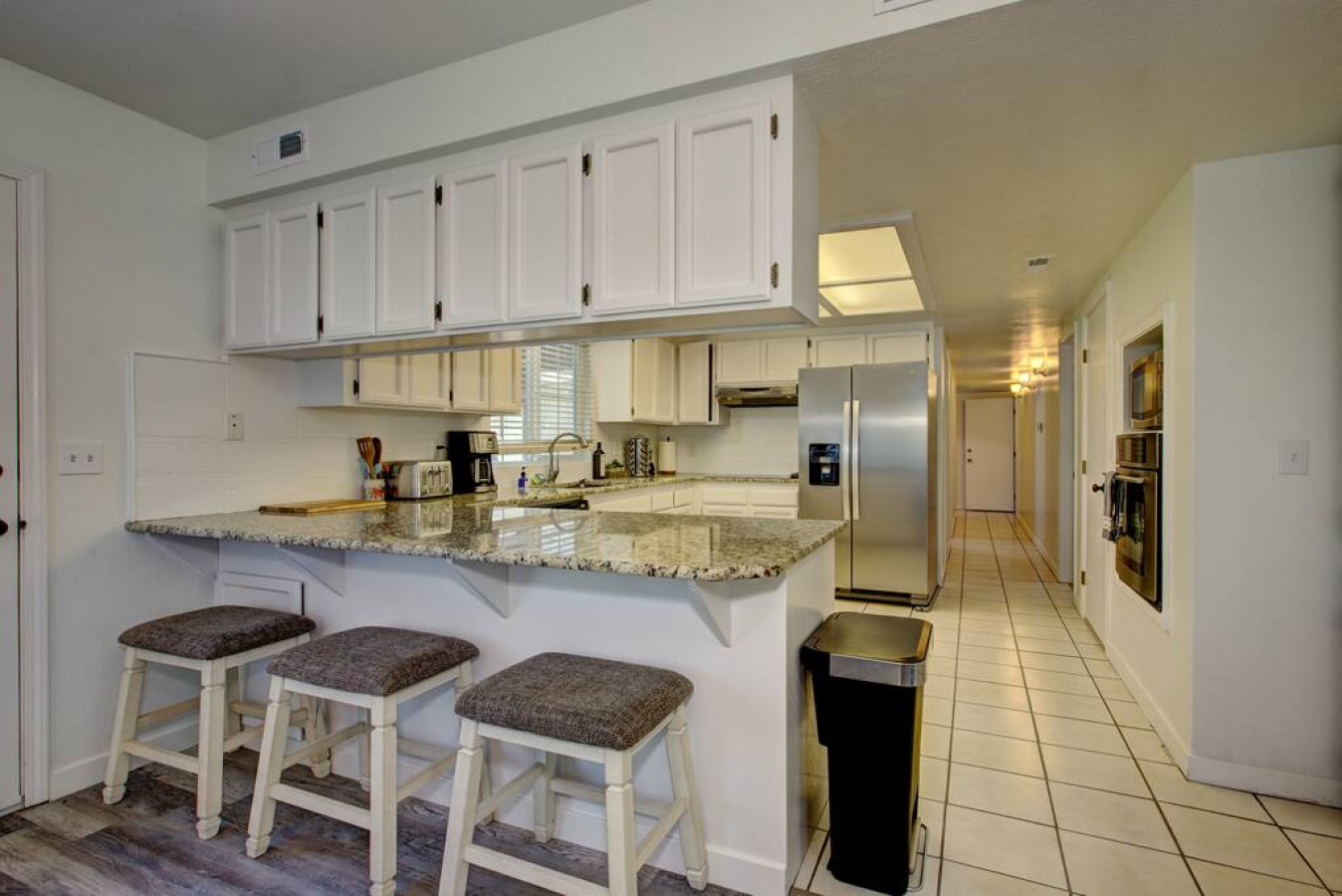 The kitchen is a culinary haven, equipped with modern appliances, a brand new refrigerator and ample counter space, allowing you to whip up delicious meals with ease. Enjoy your creations in the elegant dining area, or opt for a casual meal at the breakfast bar, which also doubles as a convenient spot for morning coffee and conversation.