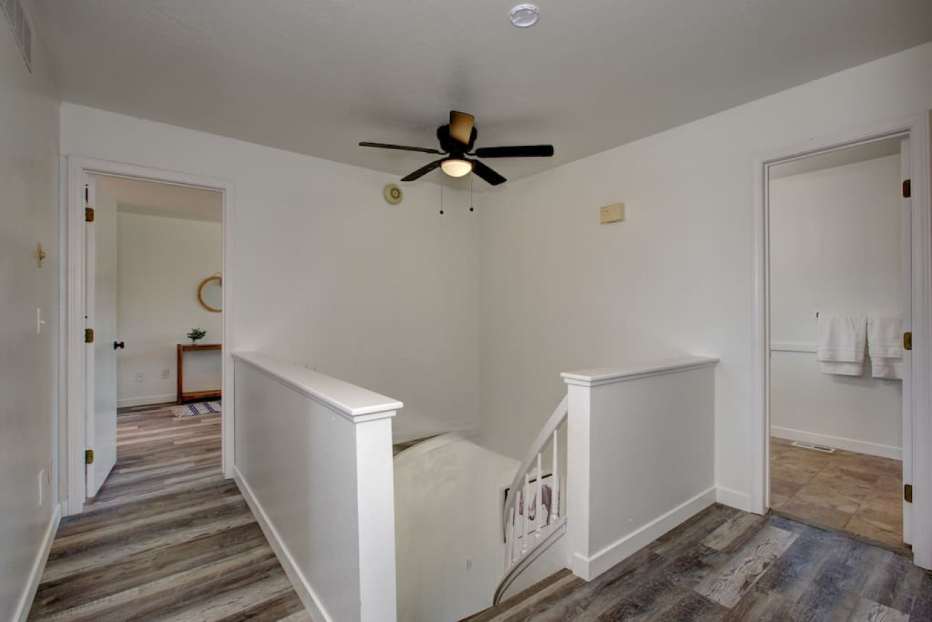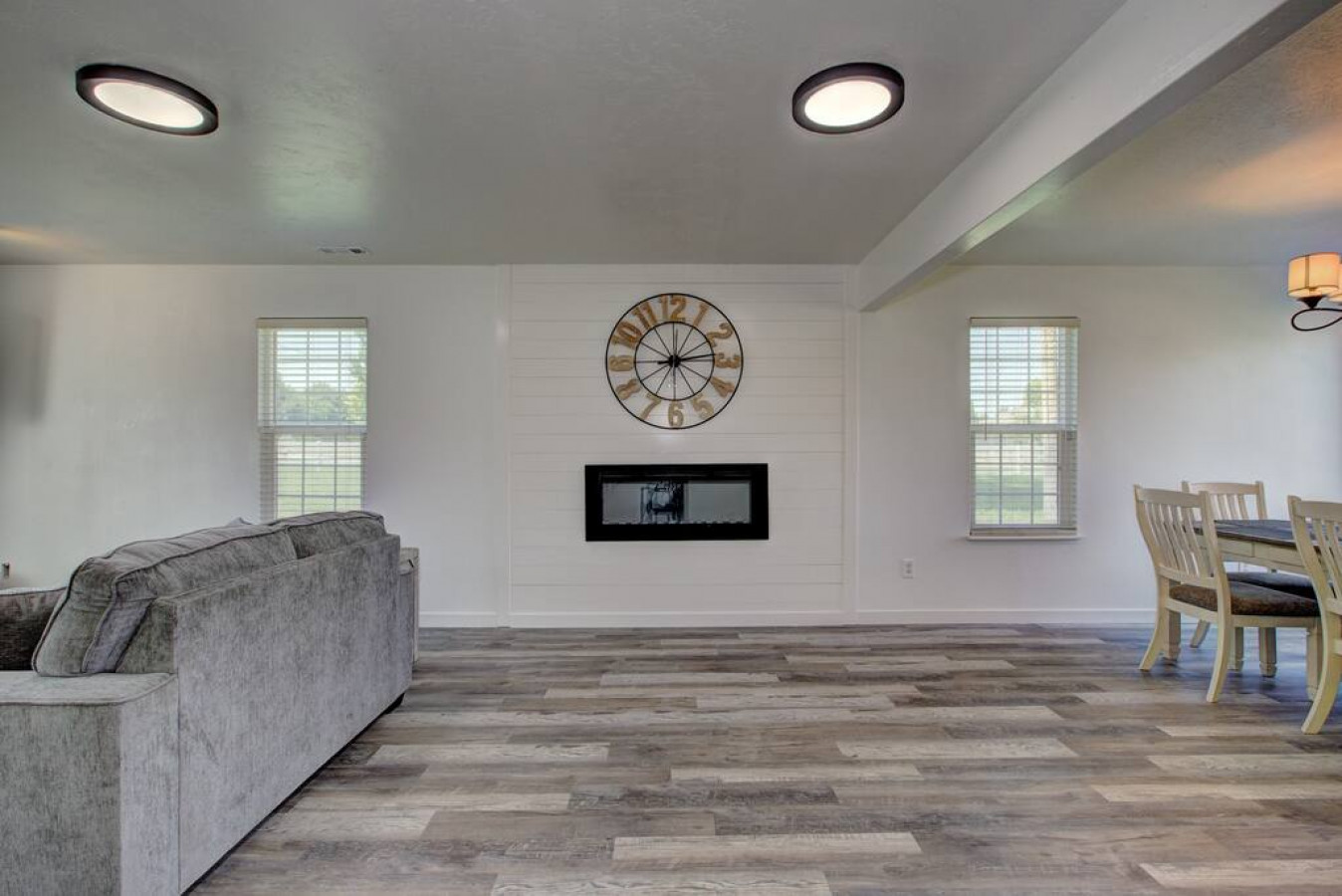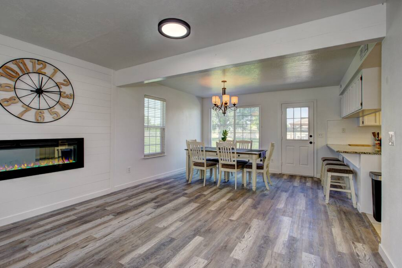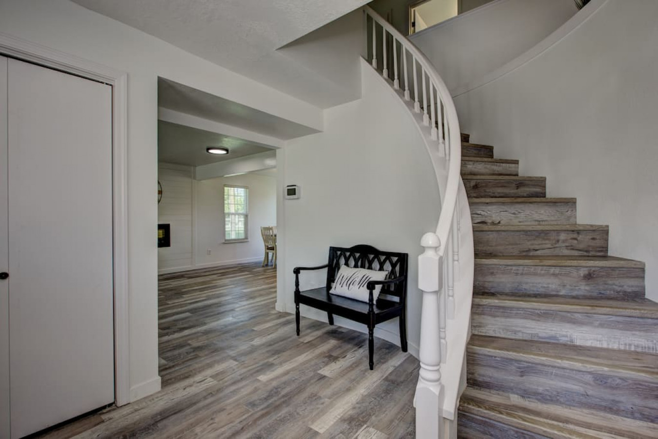 As you step inside, you'll be greeted by a white winding staircase. You'll feel just like Cinderella walking up the stairs. Step inside the etnryway to a warm and welcoming ambiance that sets the tone for your stay. The open-concept living area boasts ample natural light, tasteful decor, comfortable furnishings, and an electric fireplace in the wall creating an inviting space for relaxation and socializing.